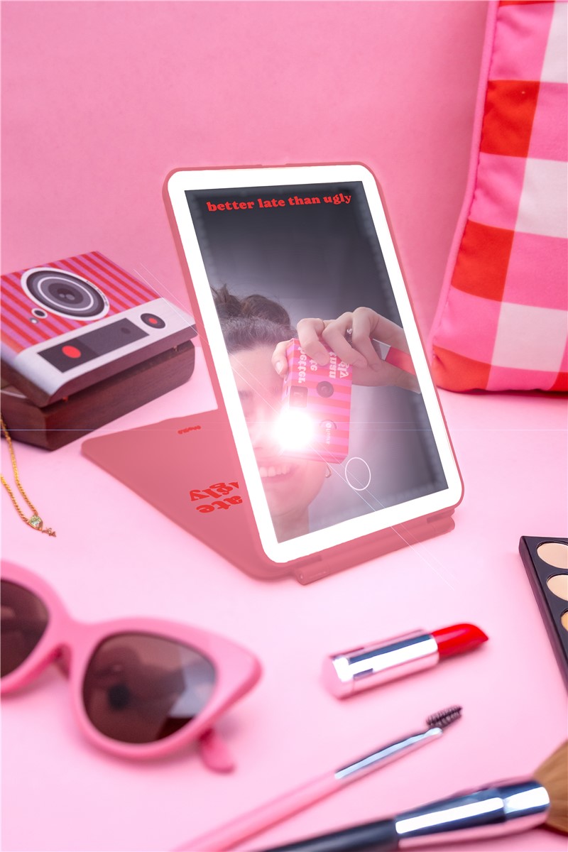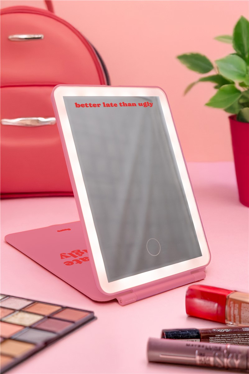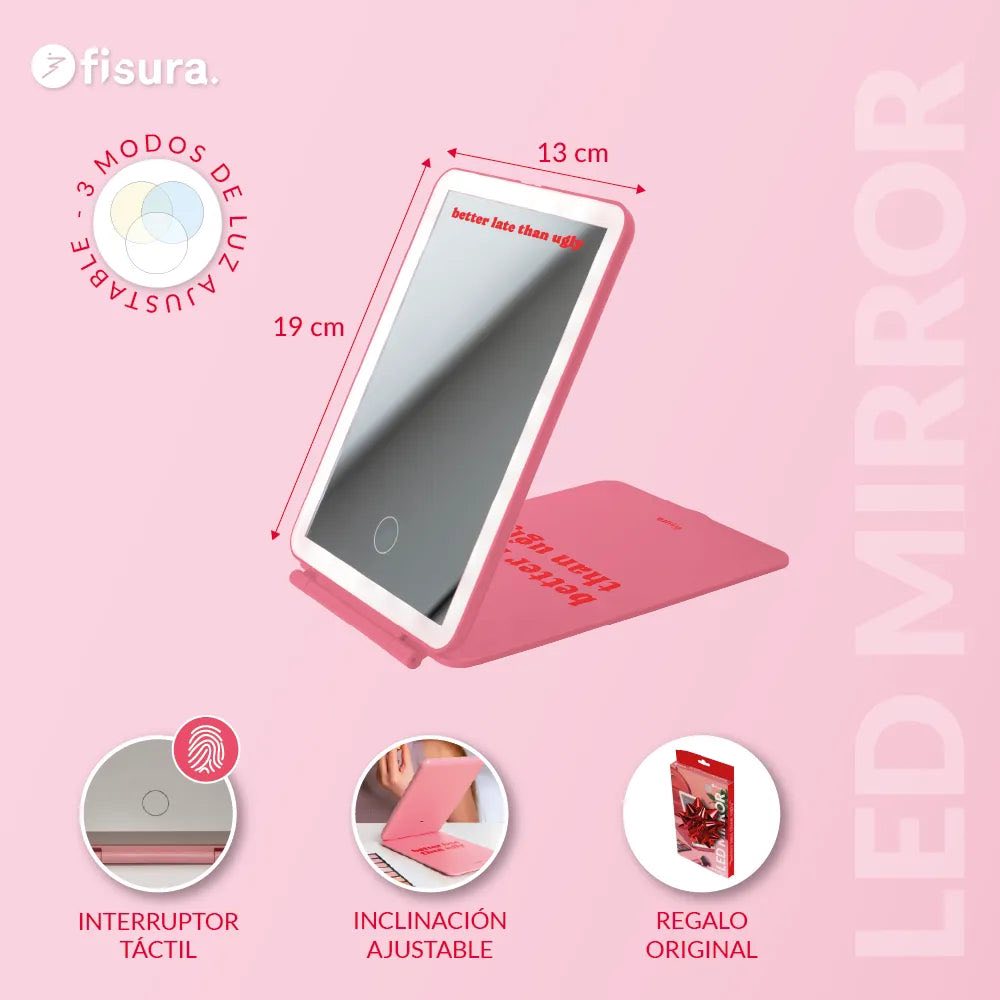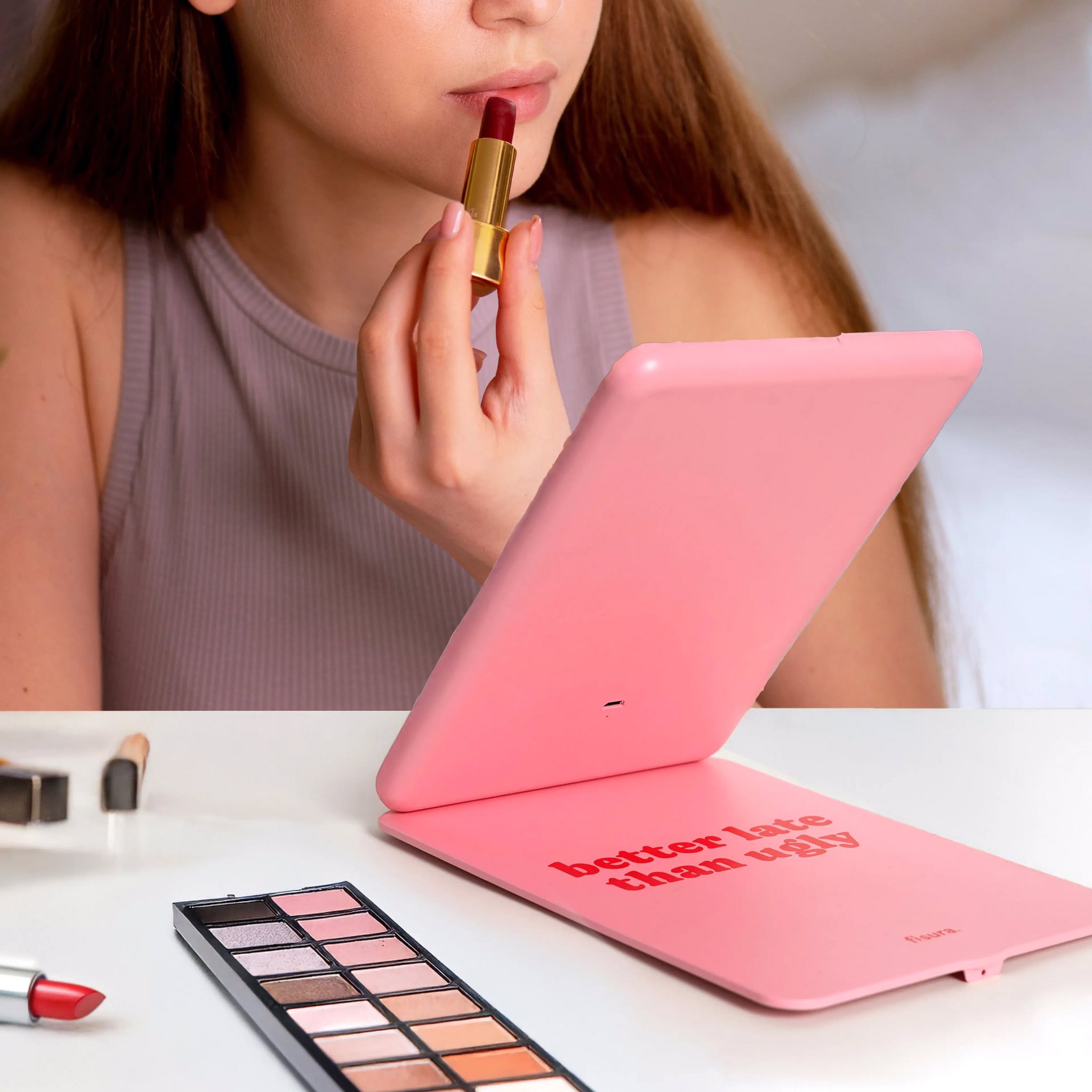 Si tu lema es no salir nunca de casa sin estar lista para brillar, este espejo portátil con luz y su mensaje“better late than ugly” será tu compañero inseparable ✨. Además, es un espejo de viaje compacto y plegable, por lo que cabe sin problema en la maleta, en un bolso grande o donde lo necesites para tus planes fuera de casa.