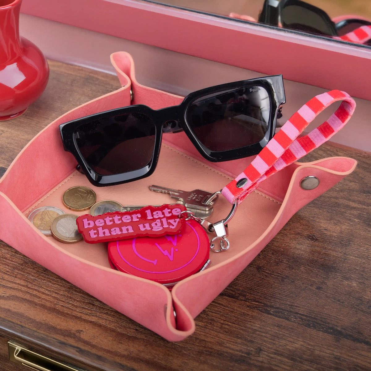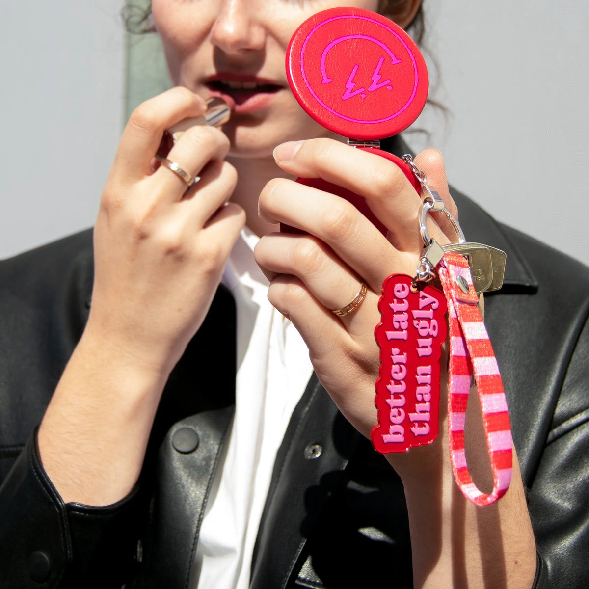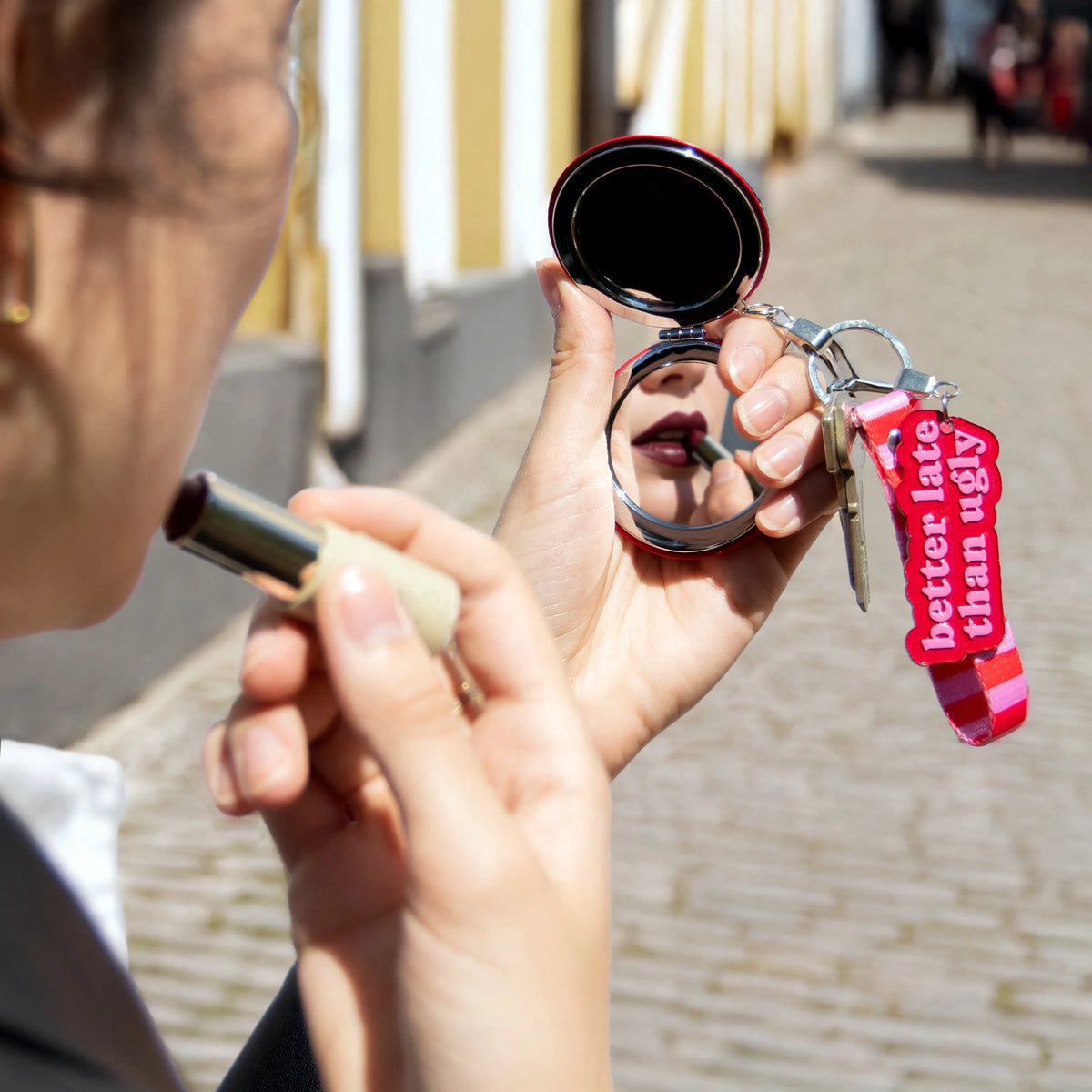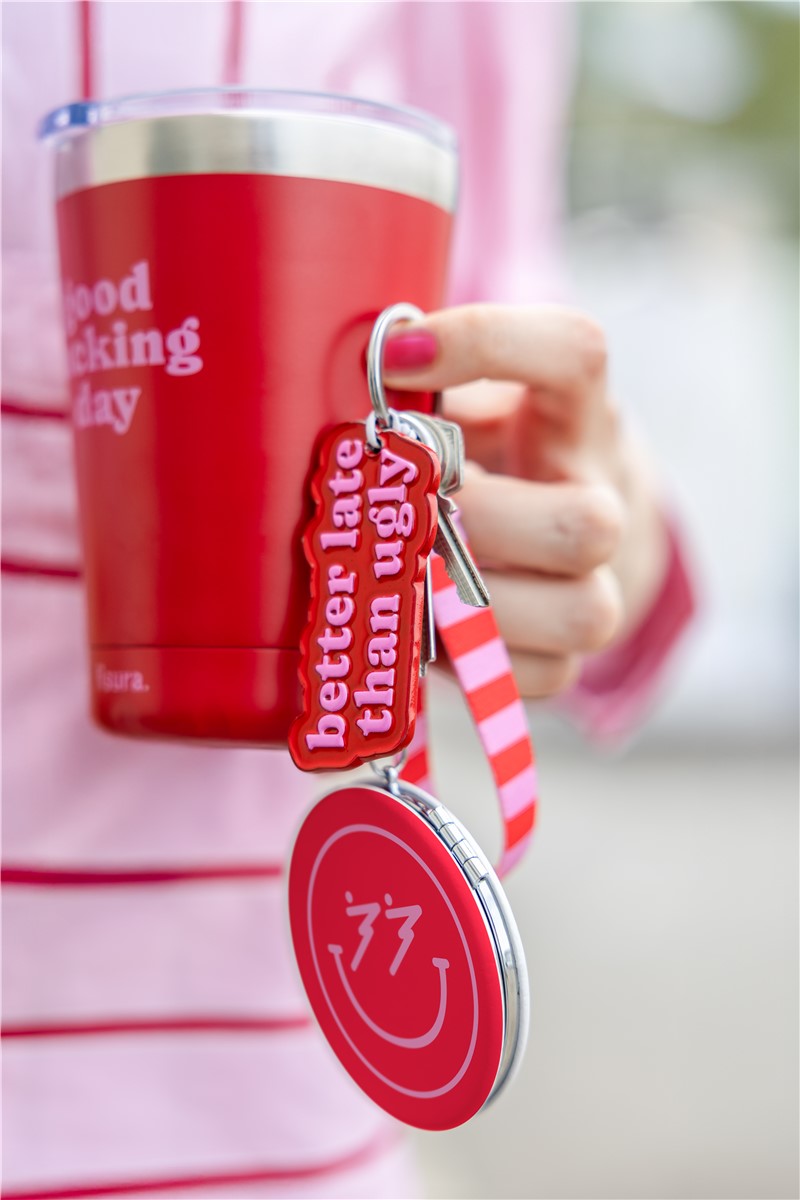 Si eres de las que prefieren llegar tarde, pero nunca sin ir divina 💄, este llavero original con el mensaje “Better late than ugly” es para ti. Perfecto para esas mañanas caóticas en las que el reloj corre más rápido que tú, pero el espejo sigue siendo sagrado.