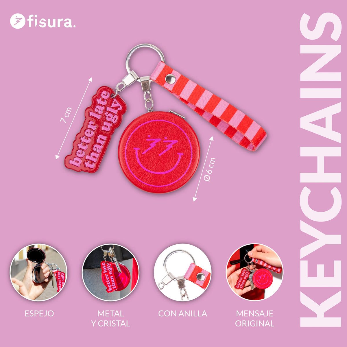 Este llavero metálico tiene un espejo para que puedas retocarte en cualquier parte: antes de una reunión, una cita o para esa foto improvisada con tus amigas 📸.