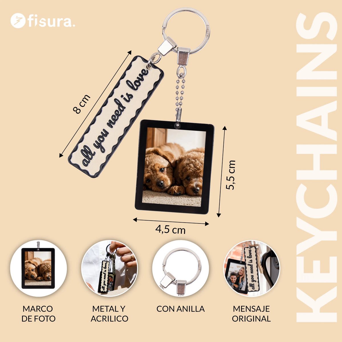 Este llavero con foto es perfecto para que lo lleves contigo a quien más quieres 📸 (tu pareja, tu mascota, tu familia o esa foto que te alegra el día), y está hecho con materiales resistentes por lo que resistirá a tu caótico bolso.