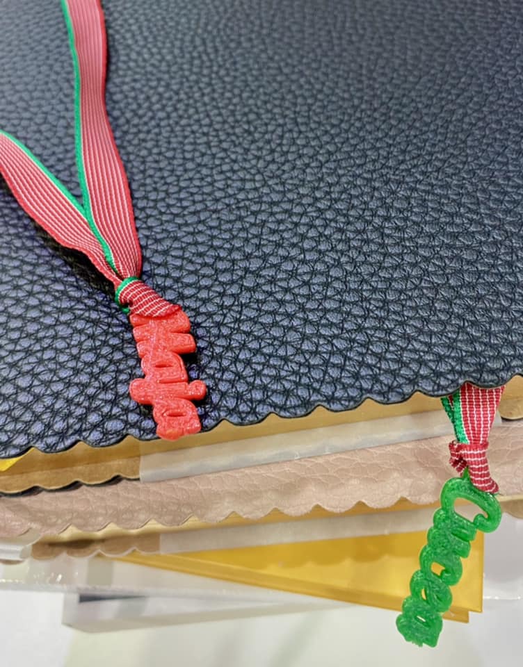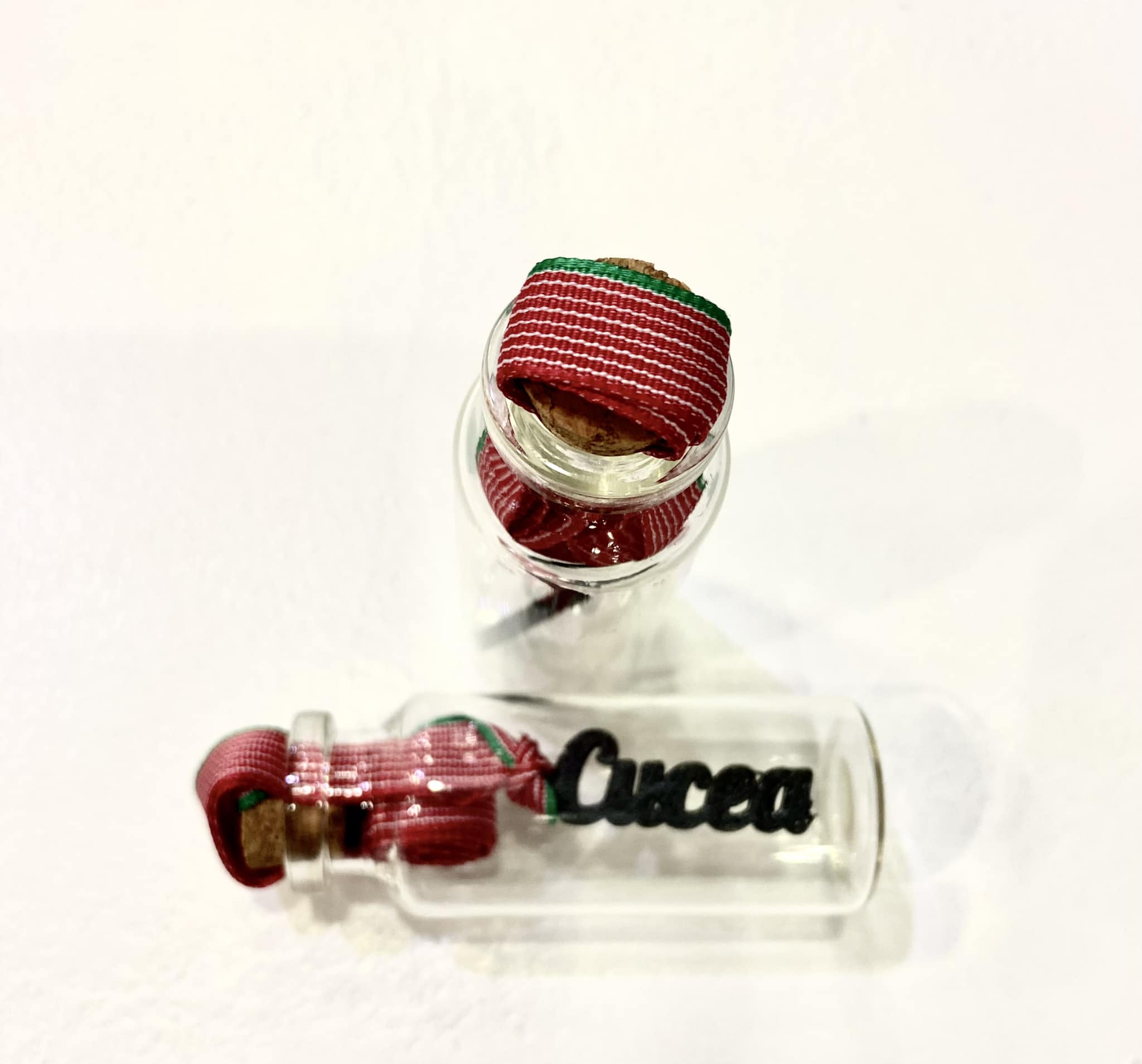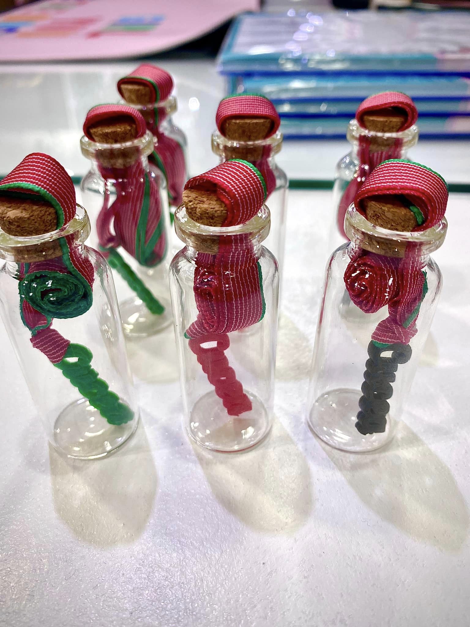El marcapáginas va dentro de un botecito de cristal con tapón de corcho.