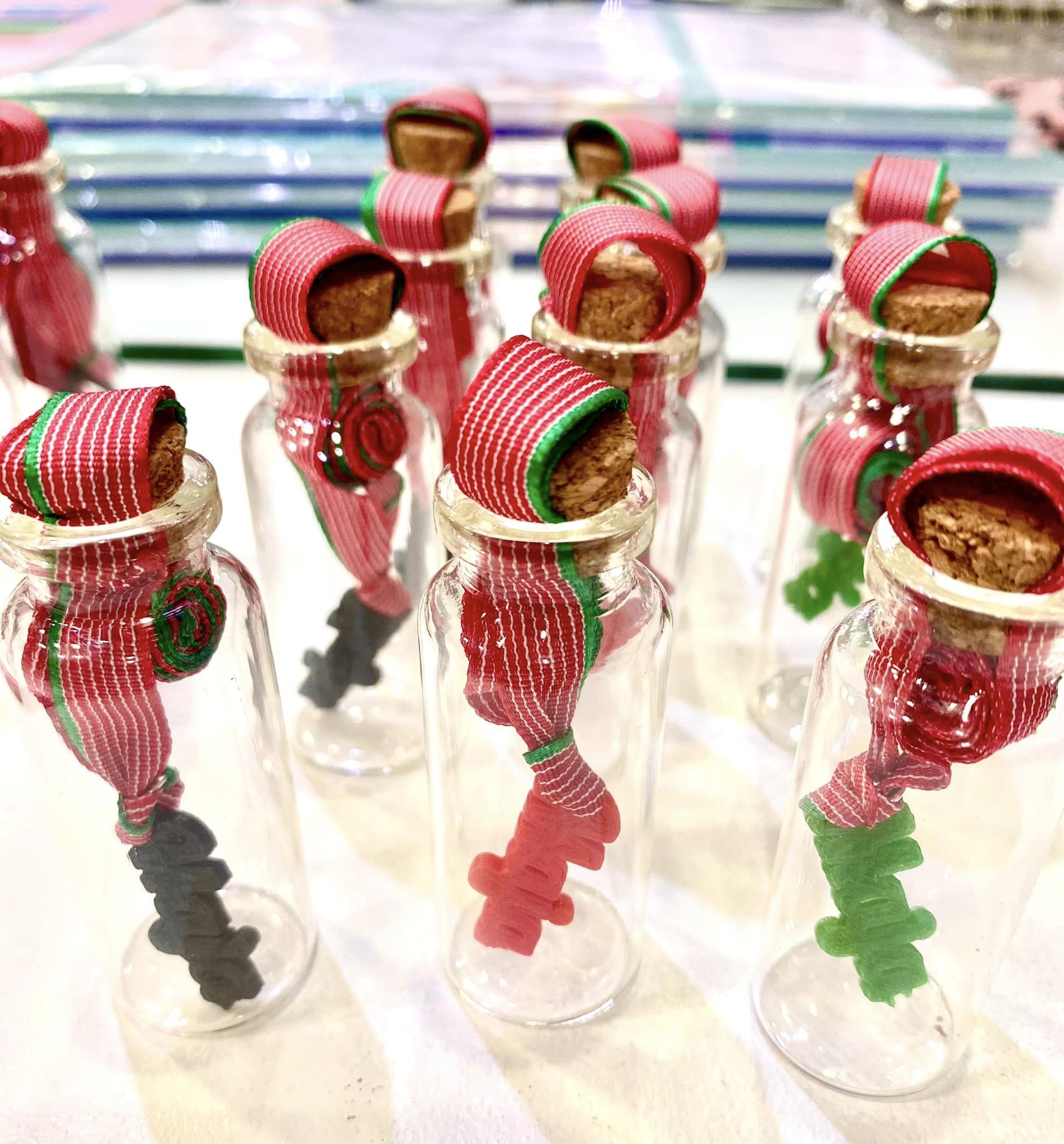 El marcapáginas va dentro de un botecito de cristal con tapón de corcho.