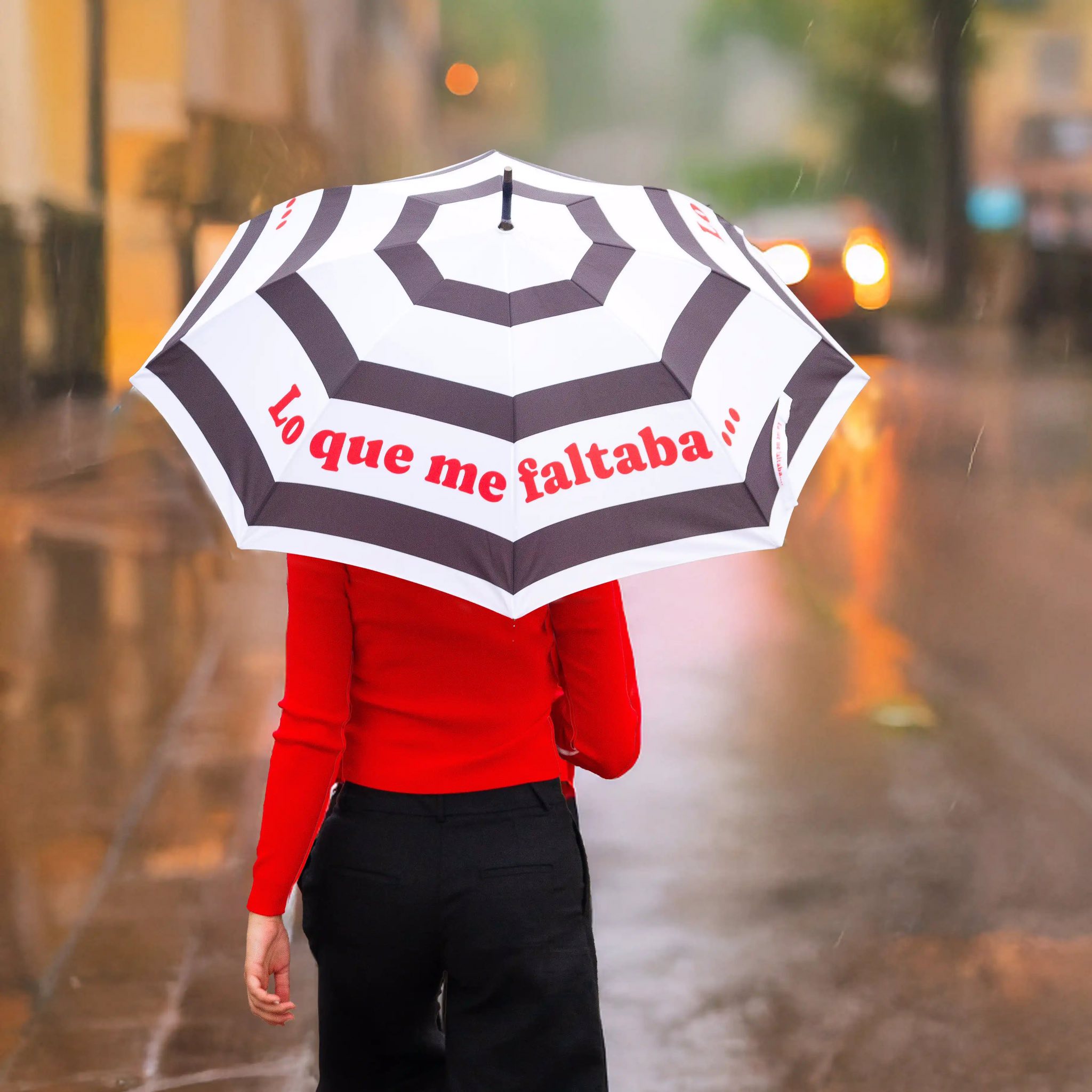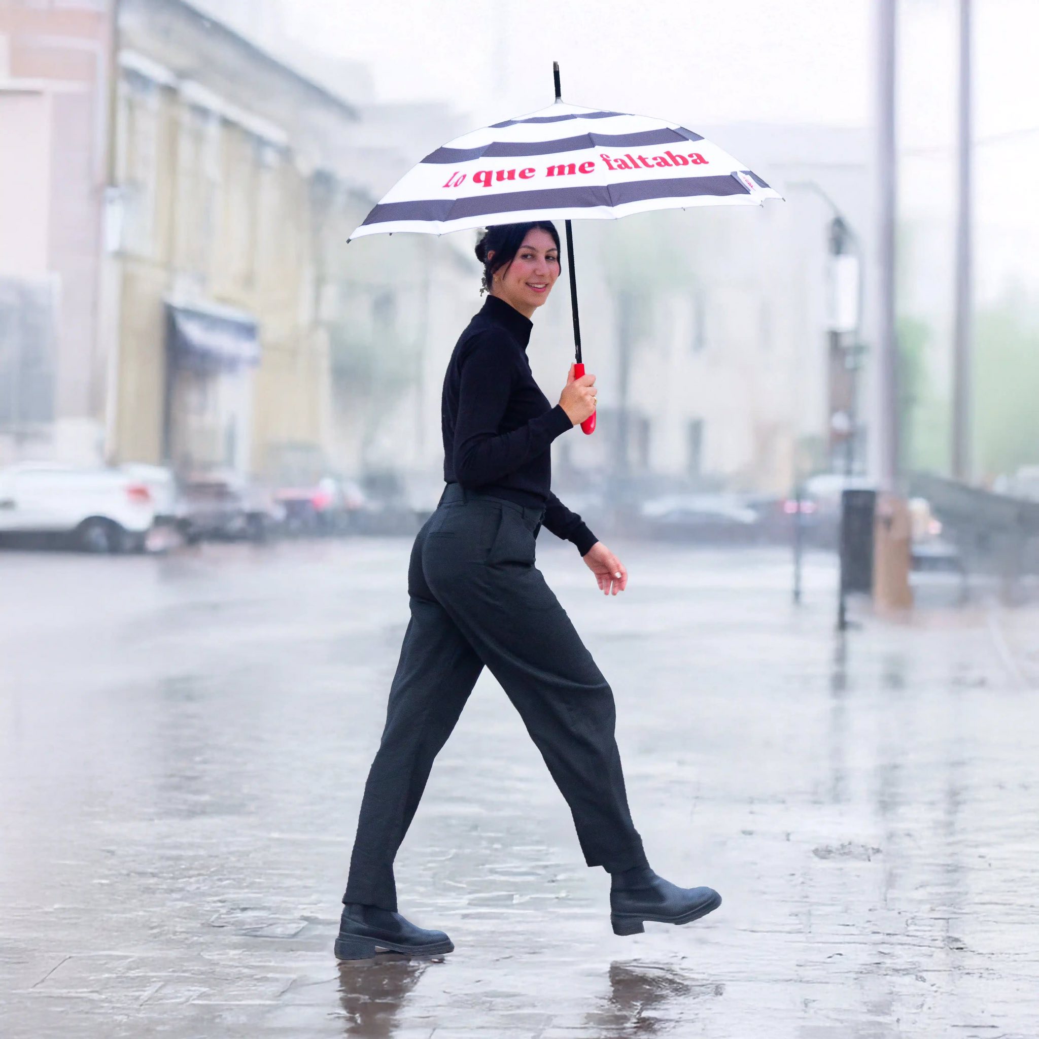 ¡Porque cuando vas con mil cosas en la cabeza… encima se pone a llover! 🌧️ Este paraguas original de rayas y su mensaje “lo que me faltaba” es perfecto para tomarte el mal tiempo con humor. ¡Es ideal para gritar a los cuatro vientos que tu día ya venía fuerte antes de que cayera la primera gota!